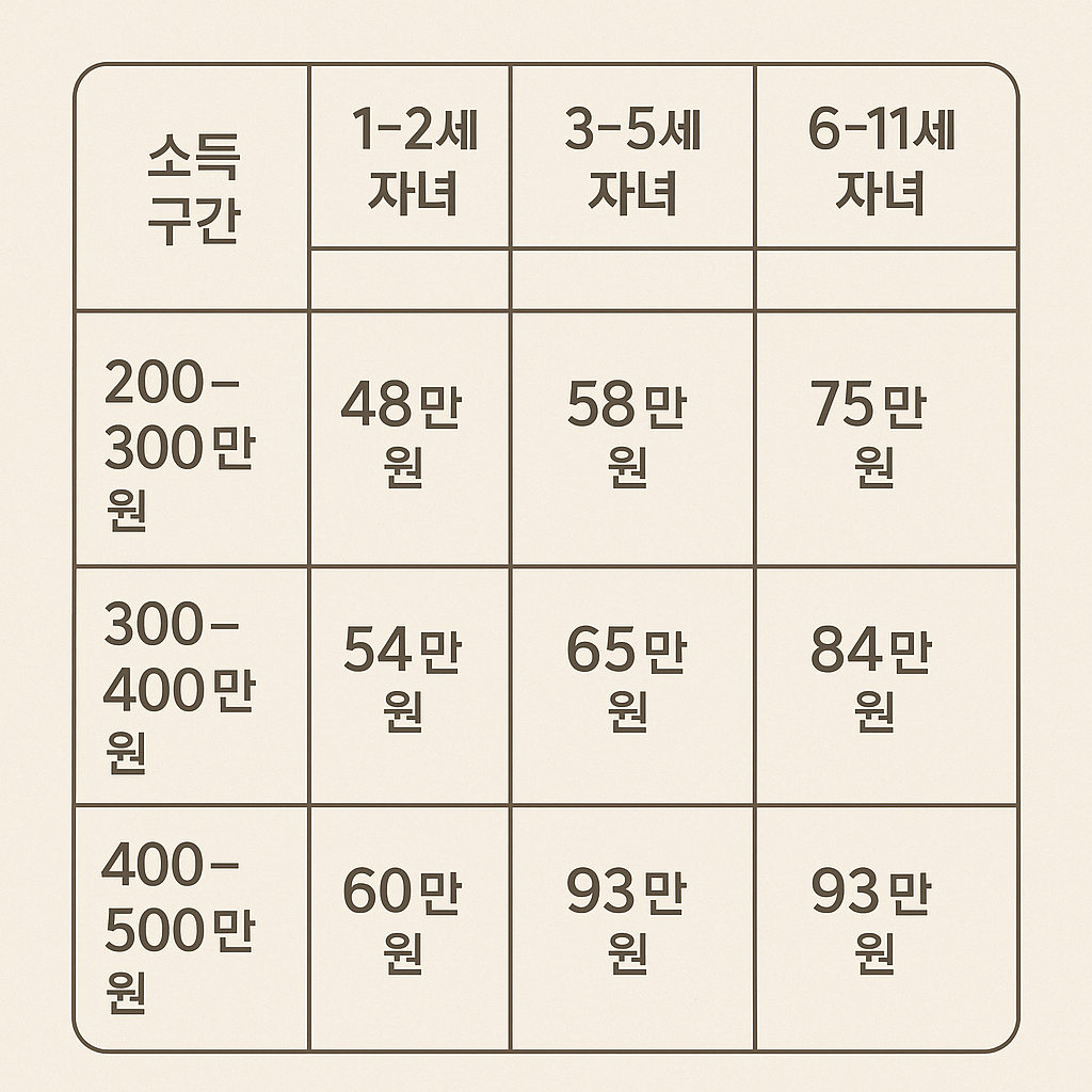 | 부모 순소득(합산) | 0~2세 | 3~5세 | 6~10세 | 11~14세 | 15~18세 |