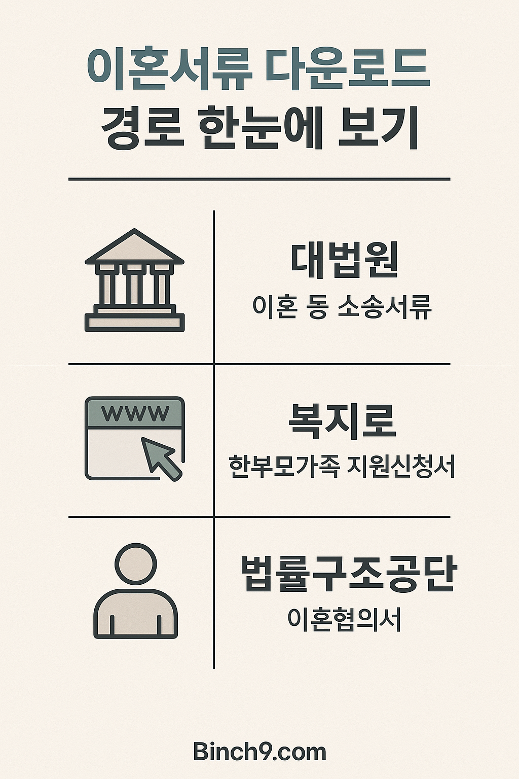 인포그래픽 제안: ‘이혼서류 다운로드 경로 한눈에 보기’ – 대법원·복지로·법률구조공단 각 기관별 역할 정리