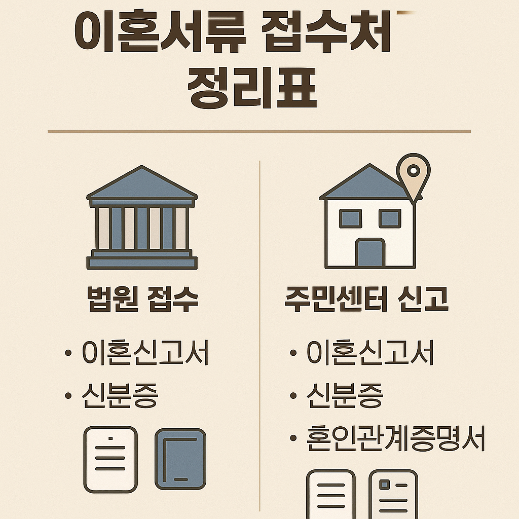 인포그래픽 제안 : ‘이혼서류 접수처 정리표’ – 법원 접수 vs 주민센터 신고 구분표 + 준비물 시각화