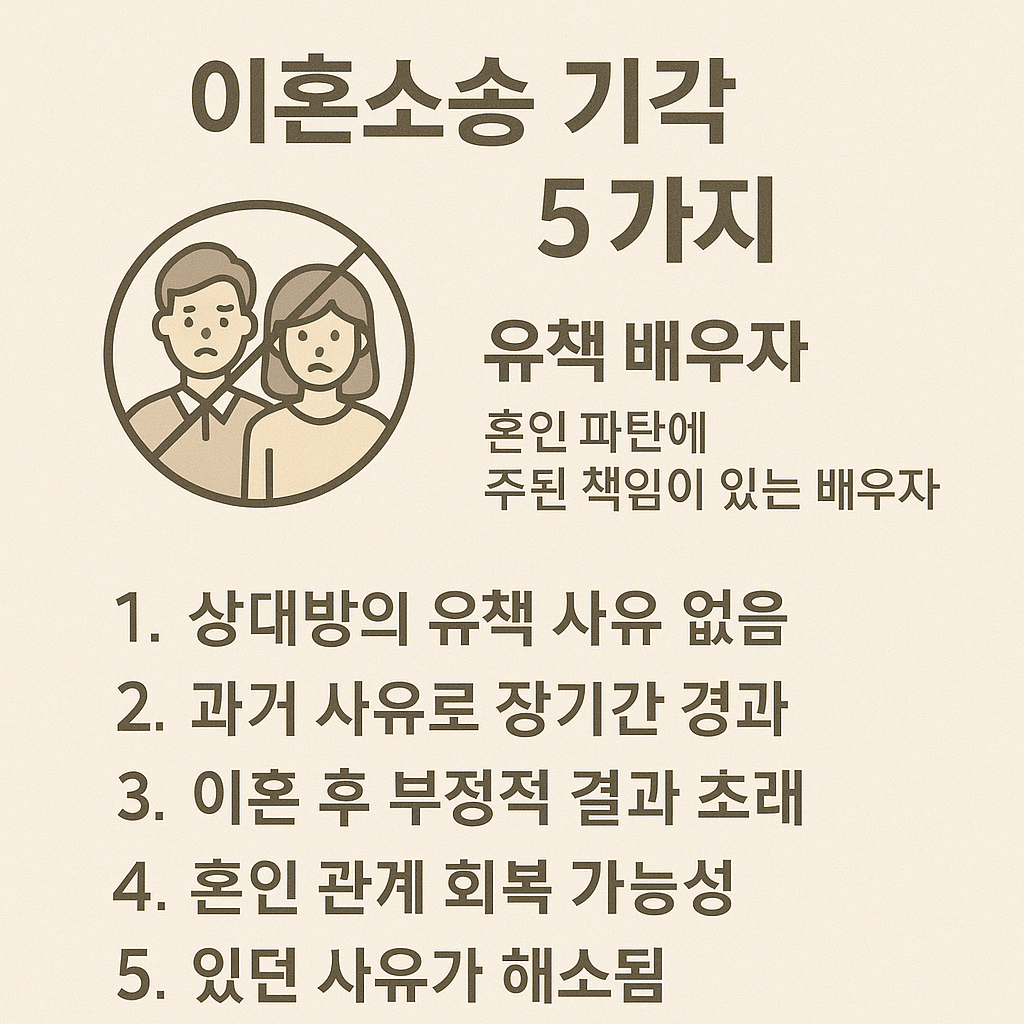 인포그래픽 제안: ‘이혼소송 기각 사유 5가지’ – 판례 기반으로 대표 사례 + 원인 정리 + 유책 배우자 개념 시각화