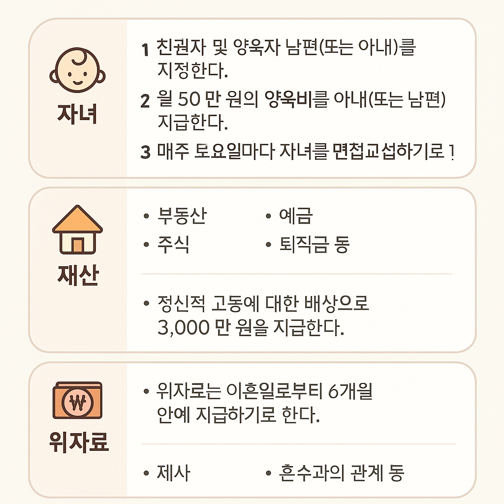 - 자녀 양육 관련: 누가 키울지, 양육비는 얼마나 줄지, 면접교섭은 어떻게 할지 등을 명확히 정리해요.