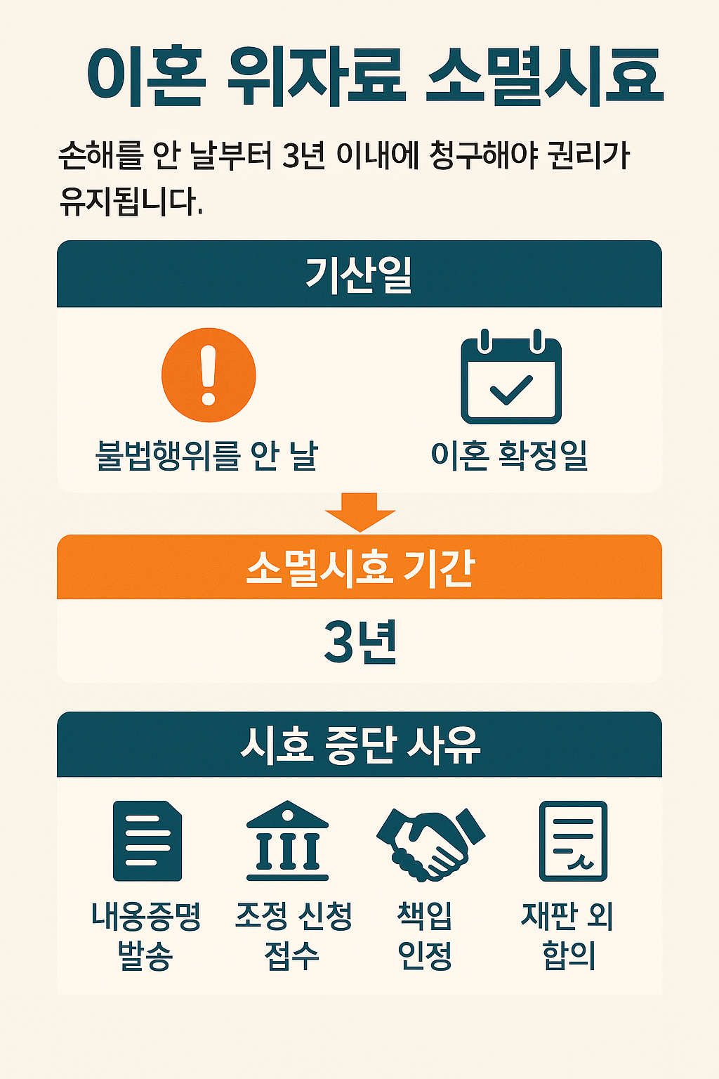 위자료 소멸시효 기준과 중단 가능 사유를 인포그래픽으로 정리해보세요. 시효 관리 흐름도나 기산일 계산법 등을 시각화하면 좋아요.