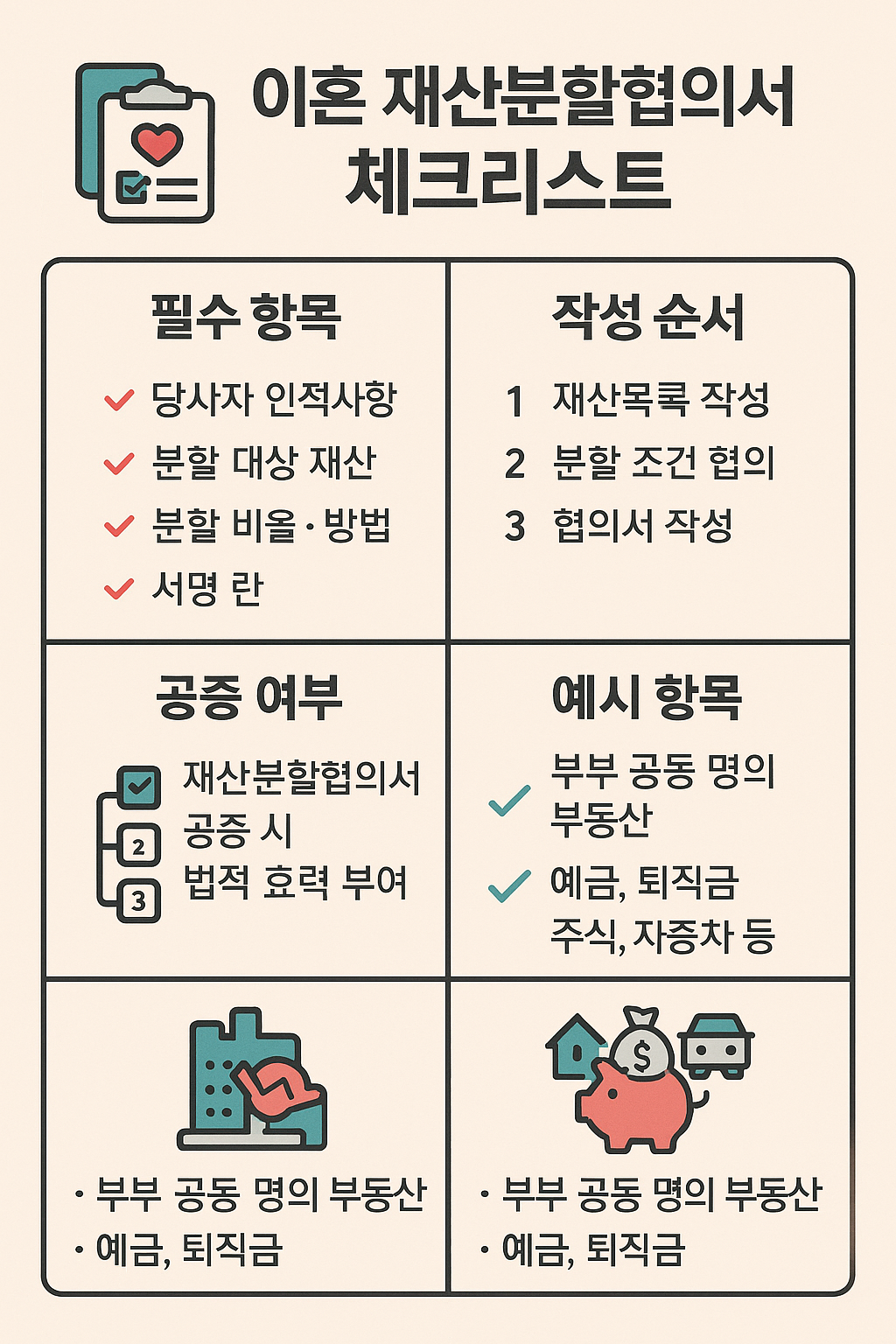 인포그래픽 제안: ‘이혼 재산분할협의서 체크리스트’ – 필수 항목, 작성 순서, 공증 여부, 분할 예시 항목 요약 도식화