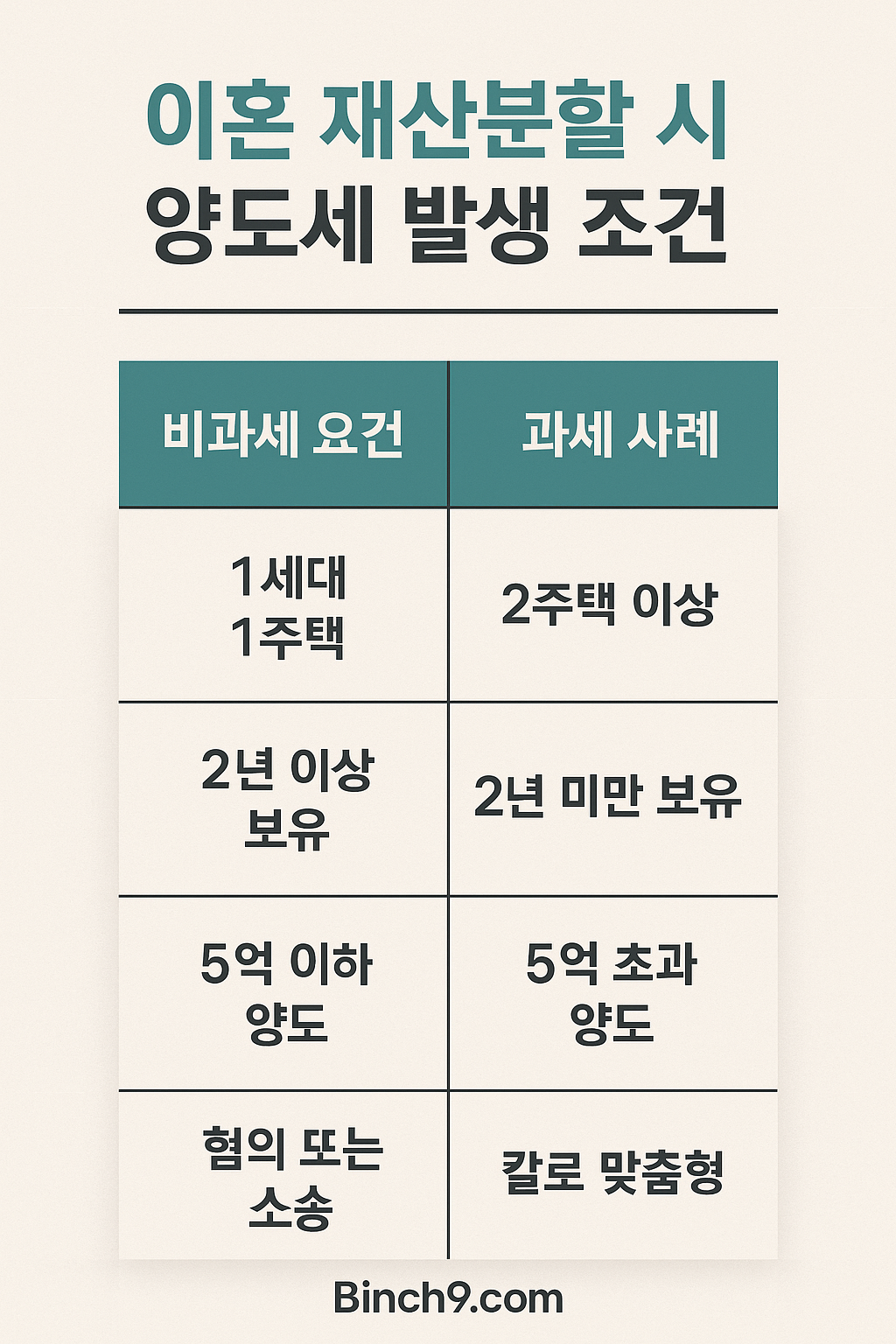 인포그래픽 제안: ‘이혼 재산분할 시 양도세 발생 조건’ – 비과세 요건 vs 과세 사례 비교표
