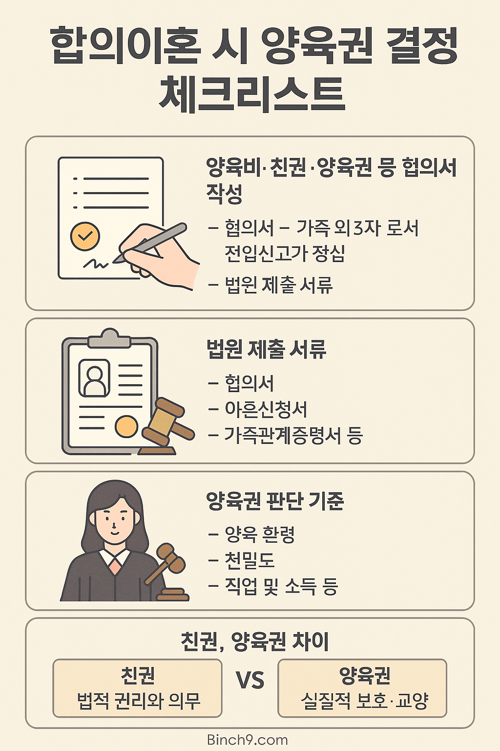 인포그래픽 제안: ‘합의이혼 시 양육권 결정 체크리스트’ – 협의서 작성 항목, 법원 제출서류, 판단기준, 친권·양육권 차이 비교